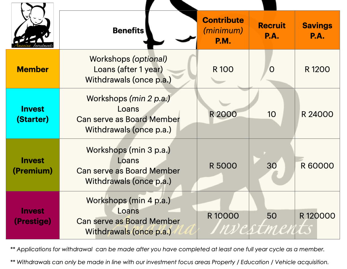 Amanina Investments is an organisation started by women for informing, educating and empowering women to create an investment based and debt free financial future for our members. While the organisation is women founded and managed we offer savings and investment opportunities for women, men and children. We are currently recruiting new members as part of our initiative to register as a Co-orperative Financial Institution.